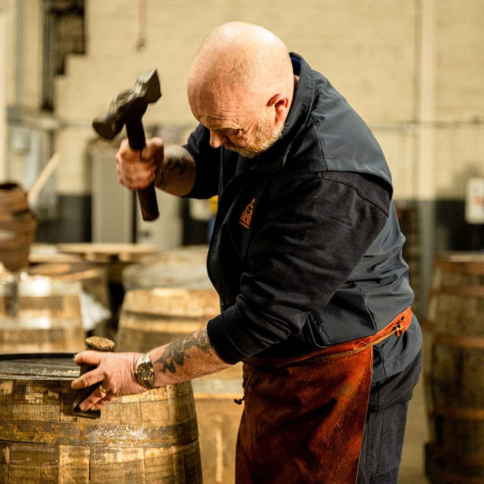 而最重要的是,桶匠是一門無法單靠書本習得的技術。如何僅憑肉眼觀察木條的紋理以確保不滲漏?如何精準感知火候讓木纖維在斷裂邊緣達成完美弧度?這些「體感知識」全賴學徒制世代相傳。在自動化機械橫行的時代,這群守著火爐、手握槽刨與重槌的匠人,成了酒廠靈魂的重要守衛者之一。