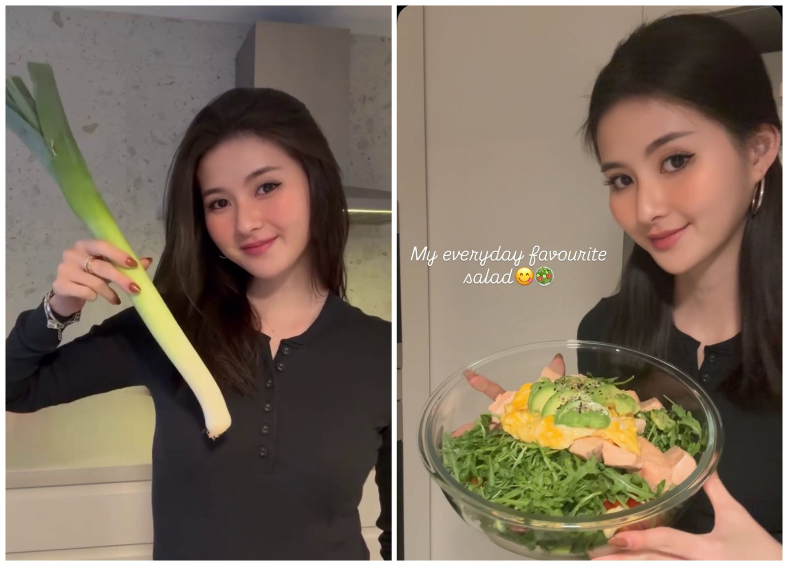 廖思惟在新開的烹飪IG帳號「@inmomentsofstillness」上傳新影片,教大家做她每天都會吃、也是最喜歡的沙拉。影片一開始,可見她先將大蔥切段,再把青蔥、番茄、芝麻葉依序切好,一起放入大碗中,她用創意剪輯手法呈現,畫面相當可愛。