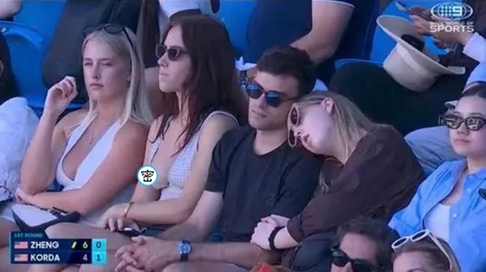 2026年澳洲網球公開賽火烈開打,近日Threads上瘋傳一張場邊焦點照,只見觀眾台有2個正妹帶著墨鏡看比賽,一旁則有一對情侶,女友似乎看到累了,躺在男生肩膀上休息,但醉翁之意不在酒,因為大家看的是戴墨鏡的正妹。